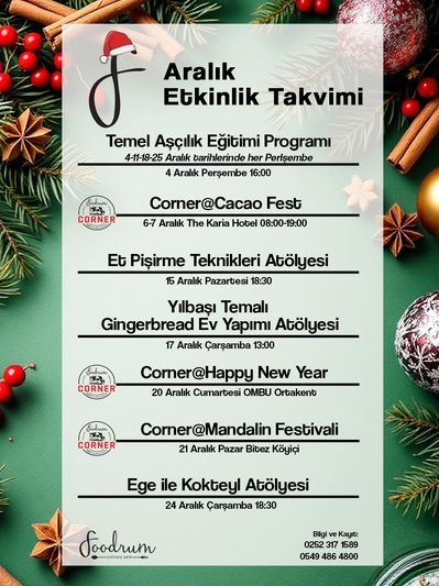 4-11-18-25 Aralık tarihlerinde her Perşembe 16:00’da Foodrum mutfakta. 4 Derslik Temel Mutfak Eğitimi Konu Başlıkları; Bıçak Kullanım Teknikleri, Et Pişirme Teknikleri, Deniz Ürünleri Pişirme Teknikleri, İtalyan Mutfağı 19000 TL
