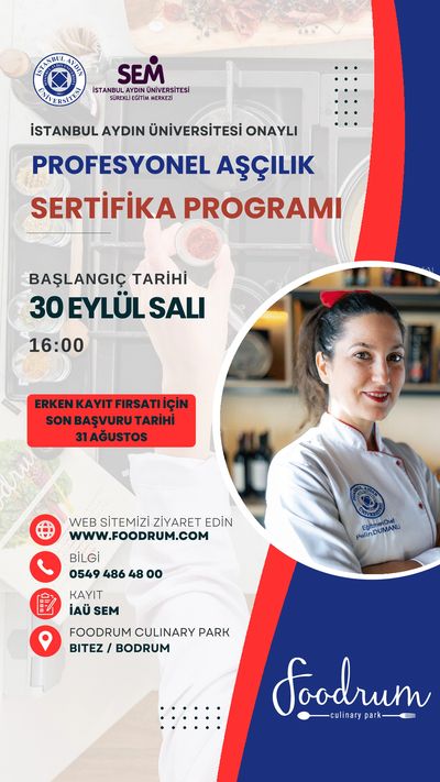 Türkiye’nin en gözde turizm merkezi Bodrum’da bulunan Foodrum Culinary Park’a hoş geldiniz. İstanbul Aydın Üniversite’si İAUSEM iş birliği ile Şef Pelin Dumanlı önderliğinde yoğun, öğretici, eğitici ve bir o kadar da güzel anılar biriktirerek sektöre doğru adım atmanızı sağlayacak eğitim programımız 30 Eylül’de başlıyor.